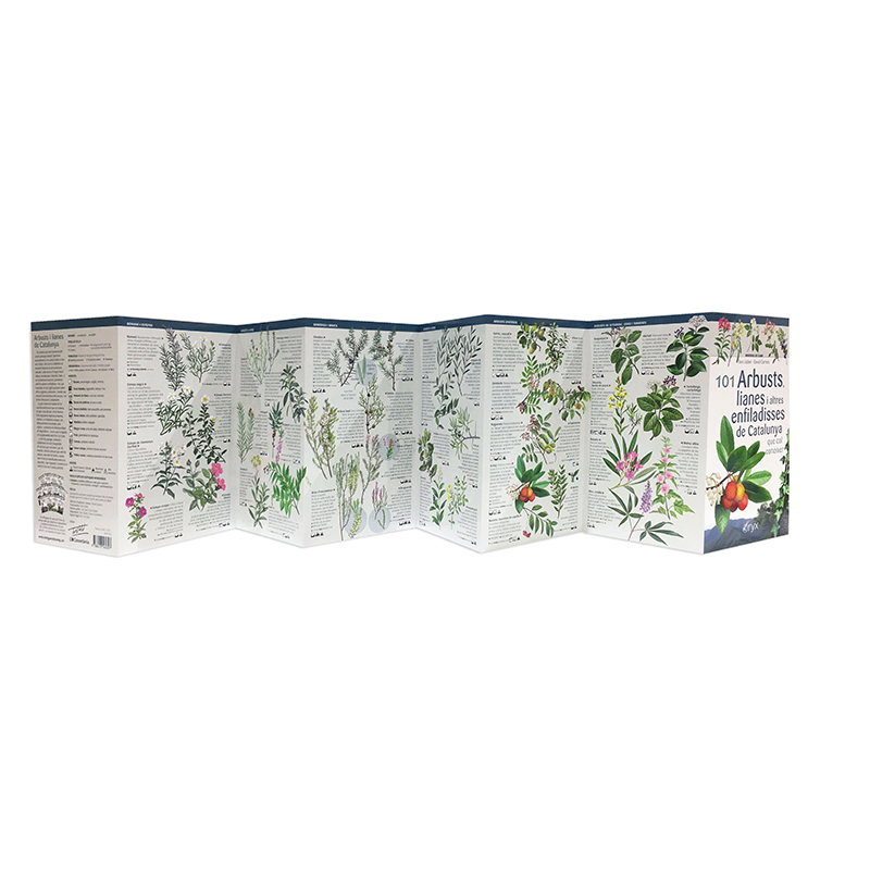 (Edición en catalán) Cómoda guía en un formato de papel plastificado desplegable. Incluye las 101 especies de arbustos, lianas y otras trepadoras que por su popularidad, abundancia u otras singularidades hay que conocer. En cada lámina encontramos ilustrados entre 6 y 8 especies diferentes, acompañados de un pequeño texto y unos iconos con información complementaria para facilitar su localización e identificación. Las especies aparecen a escala aproximada en la lámina, excepto cuando lo hacen dentro de un círculo, que muestra un detalle. En ella aparece la notación científica y el nombre en catalán, castellano e inglés.