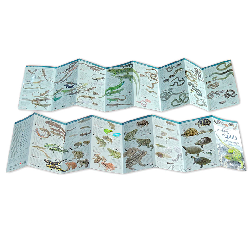 (Edición en catalán) Cómoda guía en formato de papel plastificado desplegable, donde se recogen todas las especies de anfibios y reptiles que viven en Cataluña e islas Baleares. En cada lámina aparecen ilustradas unas pocas especies a escala, incluyendo, en su caso, diferencias entre sexos, juveniles, cabezudos, puestas y detalles que ayudan al reconocimiento en el campo. Los pequeños textos descriptivos, y los iconos con información diversa, facilitan su localización e identificación. Se añade el nombre científico y el nombre popular en español e inglés.