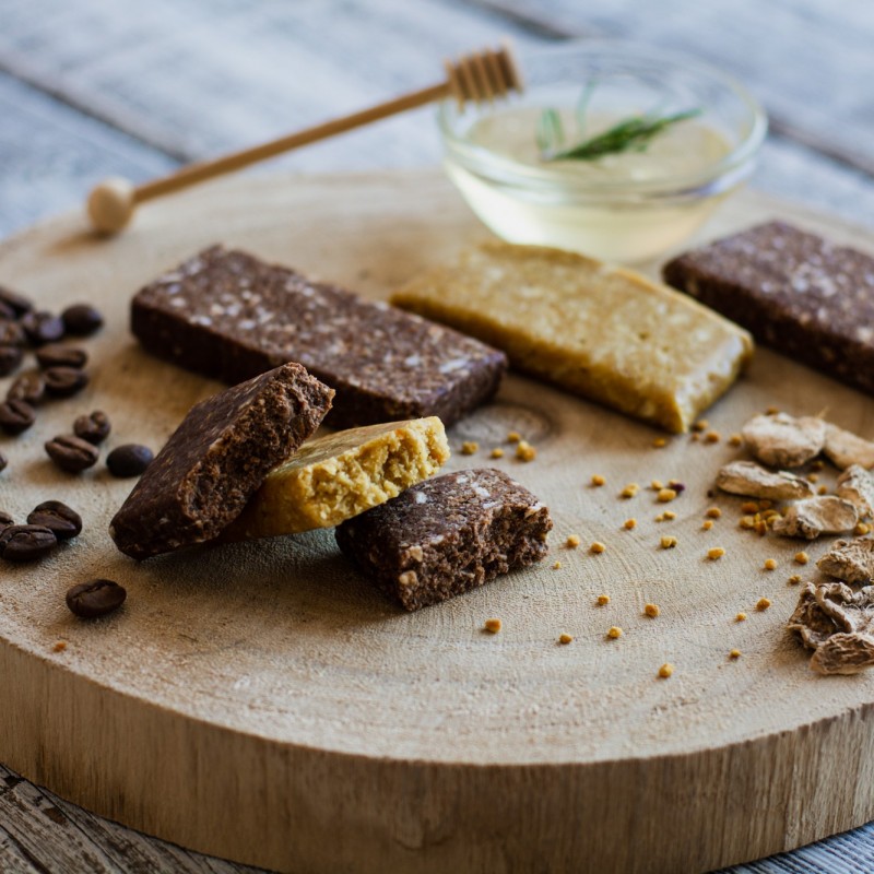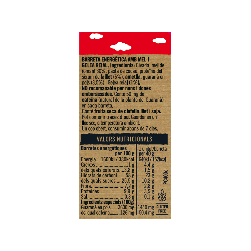 Ingredients: Civada, mel de romaní 30%, pasta de cacau, proteïna del sèrum de la llet, ametlla i guaranà en pols. Conté fruita seca de clofolla, llet i soja.