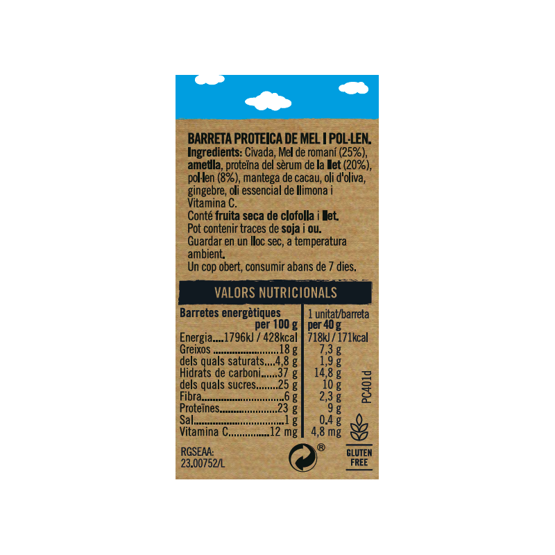 Ingredients: Civada, mel de romaní 25%, ametlla,  proteïna del sèrum de la llet, pol·len 8%, mantega de cacau, oli d'oliva, gingebre i oli essencial de llimona.