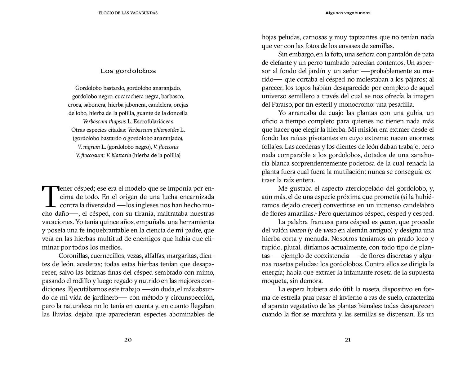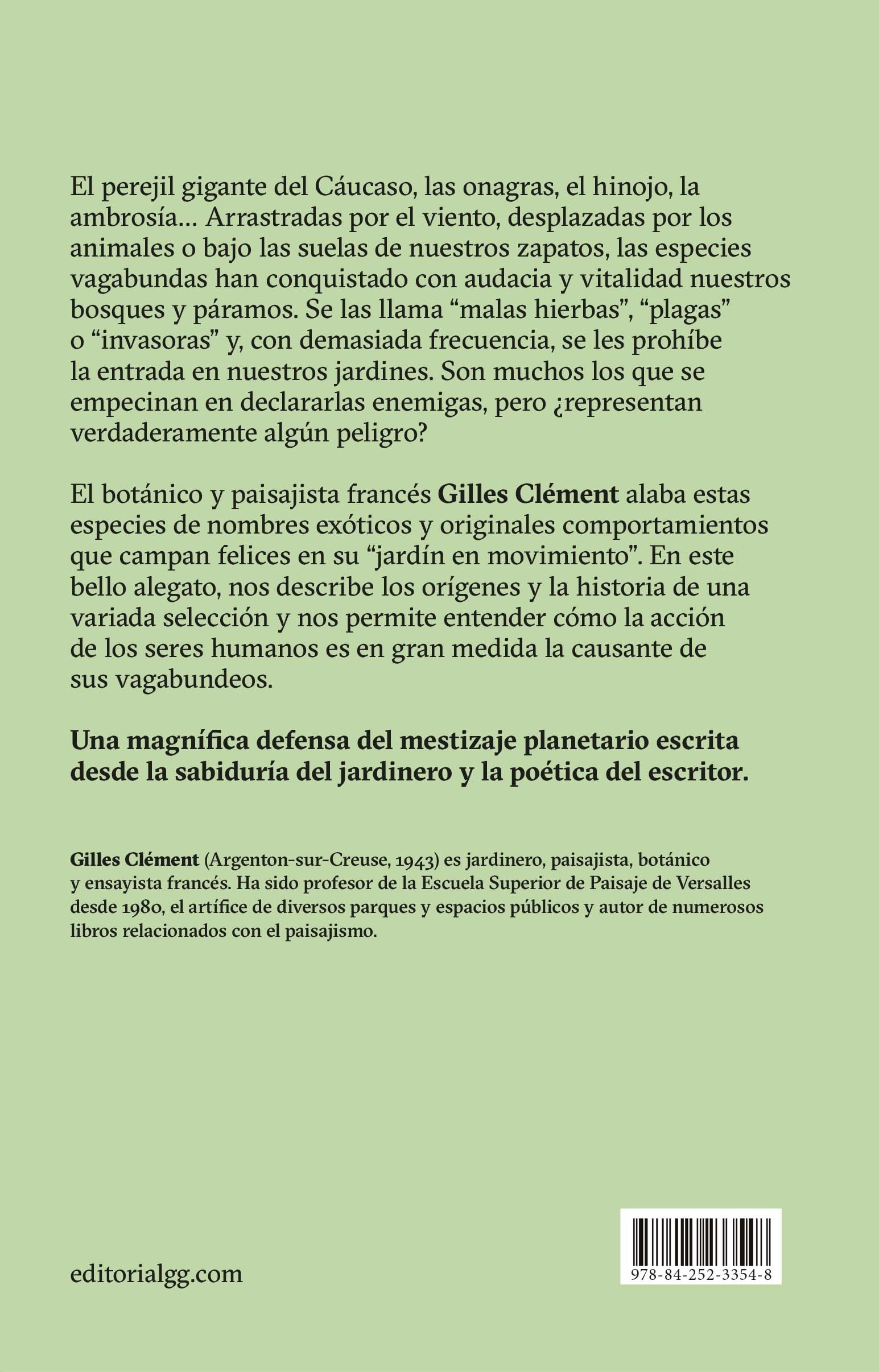 El perejil gigante del Cáucaso, las onagras, el hinojo, la ambrosía… Arrastradas por el viento, desplazadas por los animales o bajo las suelas de nuestros zapatos, las especies vagabundas han conquistado con audacia y vitalidad nuestros bosques y páramos. Se las llama “malas hierbas”, “plagas” o “invasoras” y, con demasiada frecuencia, se les prohíbe la entrada en nuestros jardines. Son muchos los que se empecinan en declararlas enemigas, pero ¿representan verdaderamente algún peligro?. El botánico y paisajista francés Gilles Clément alaba estas especies de nombres exóticos y originales comportamientos que campan felices en su “jardín en movimiento”. En este bello alegato, nos describe los orígenes y la historia de una variada selección y nos permite entender cómo la acción de los seres humanos es en gran medida la causante de sus vagabundeos. Una magnífica defensa del mestizaje planetario escrita desde la sabiduría del jardinero y la poética del escritor.