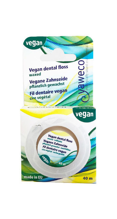 Fil dental vegà fet de PLA, encerat amb cera vegetal. Sense sabor afegit. Neta en profunditat els espais interdentals sense danyar la geniva. Tant el fil dental com la caixa* (el dispensador inclou un additiu orgànic per a accelerar la biodegradació) són biodegradables.