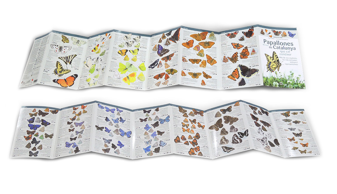 (Edición en catalán) Còmoda guia en un format de paper plastificat desplegable. Inclou més de 100 espècies de papallones que per la seva abundància, bellesa o singularitat cal conèixer. A cada làmina hi trobem il·lustrades a la mateixa escala una desena de papallones, acompanyades d'un petit text i unes icones amb informació complementària per facilitar-ne la localització i identificació. Textos en català, inclou el nom científic i el nom popular en castellà i anglès.