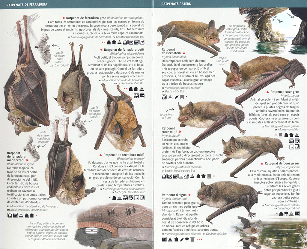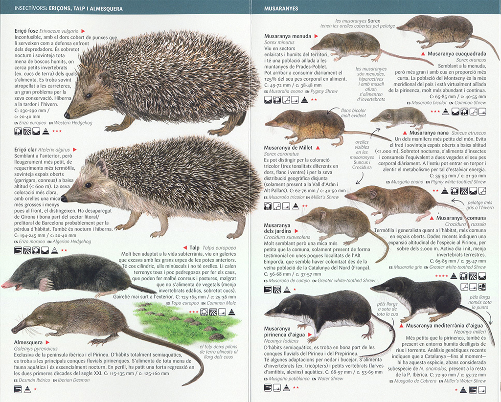Còmoda guia en un format de paper plastificat desplegable. Inclou un recull recull exhaustiu i actualitzat de la gran diversitat de petits mamífers que viuen a Catalunya. D'una banda els quiròpters -coneguts popularment com a ratpenats, rates pinyades o muricecs-, els únics mamífers voladors. De l'altra, els insectívors -eriçons, talps i musaranyes-, ara anomenats eulipotifles, i els rosegadors rates, ratolins, lirons i talpons-.. A cada làmina hi trobem il·lustracions, acompanyades d'un petit text i unes icones amb informació complementària per facilitar-ne la identificació. També hi apareixen els cranis dels principals gèneres de rosegadors i insectívors, per poder-los reconèixer en egagròpiles.