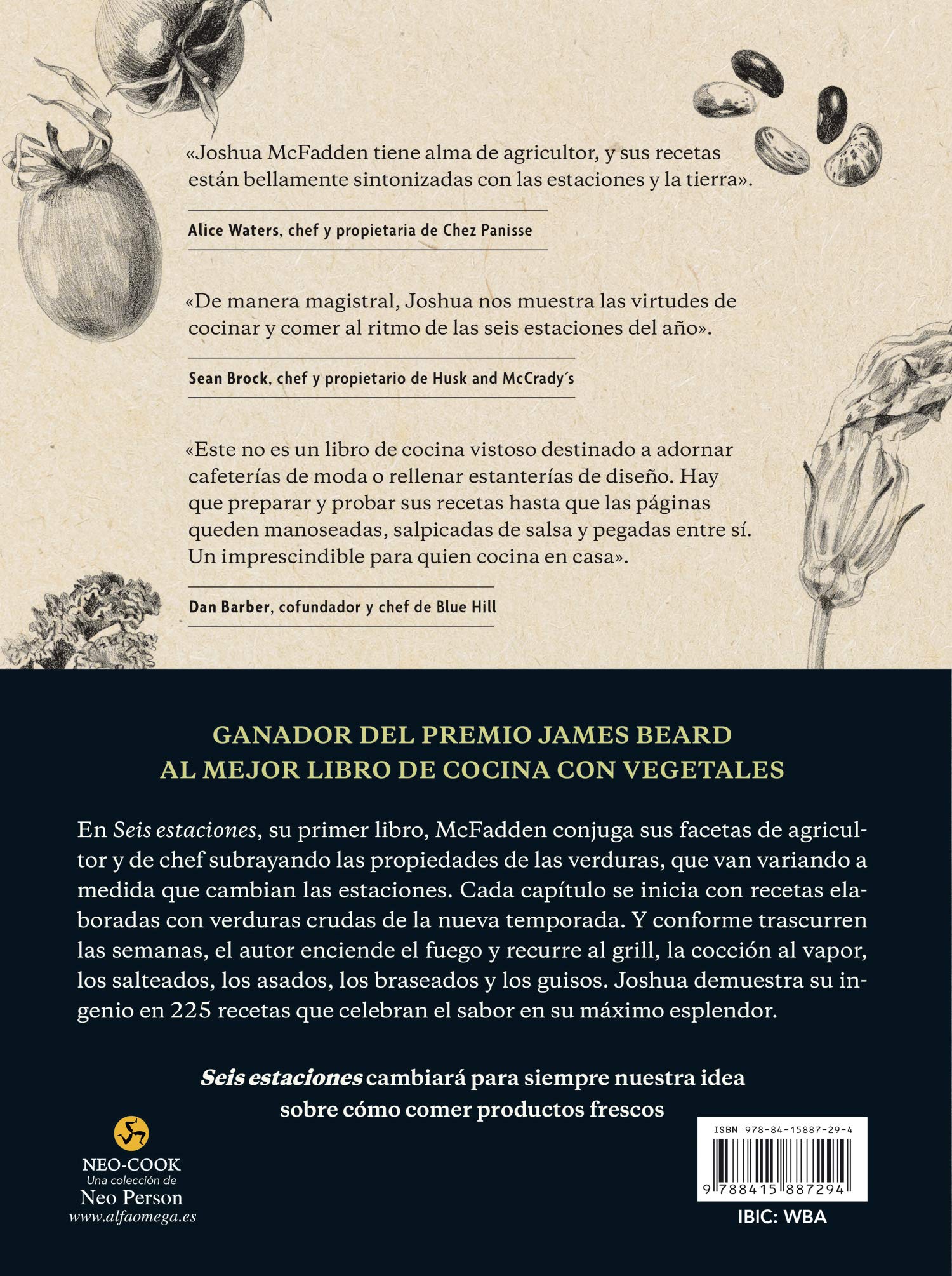 «Joshua McFadden tiene alma de agricultor, y sus recetas están bellamente sintonizadas con las estaciones y la tierra». Alice Waters, chef y propietaria de Chez Panisse «De manera magistral, Joshua nos muestra las virtudes de cocinar y comer al ritmo de las seis estaciones del año». Sean Brock, chef y propietario de Husk and McCr ady´s «Este no es un libro de cocina vistoso destinado a adornar cafeterías de moda o rellenar estanterías de diseño. Hay que preparar y probar sus recetas hasta que las páginas queden manoseadas, salpicadas de salsa y pegadas entre sí. Un imprescindible para quien cocina en casa». Dan Barber, cofundador y chef de Blue Hill «Nunca jamás había visto en un mismo libro tantas recetas fascinantes, deliciosas y fáciles de preparar… Seis estaciones es el libro de cocina más perfecto de cuantos he podido conocer… una obra a la que recurrirán repetidamente tanto los cocineros principiantes como los expertos en la materia». Lucky Peach «Joshua entiende los vegetales como chef pero también como agricultor. Sus deliciosas y espectaculares recetas sacan el máximo partido de las verduras desde que son un brote hasta que se presentan por última vez en nuestros platos». David Chang, fundador, chef y autor de Momofuku